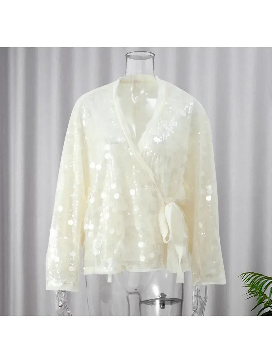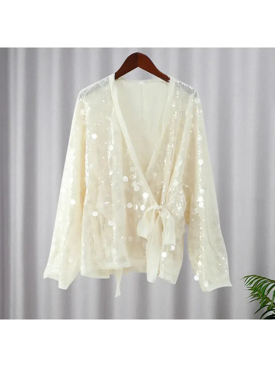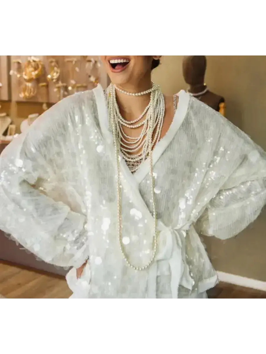 Блузка женская в стиле кимоно. Модель оверсайз, на завязках. Рубашка женская с подкладом, материал полиэстер. Внешняя полупрозрачная часть блузки украшена крупными и мелкими бусинами-пайетками. Сочетайте кимоно с класическими или спортивными брюками/юбками/обувью.