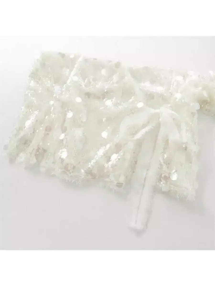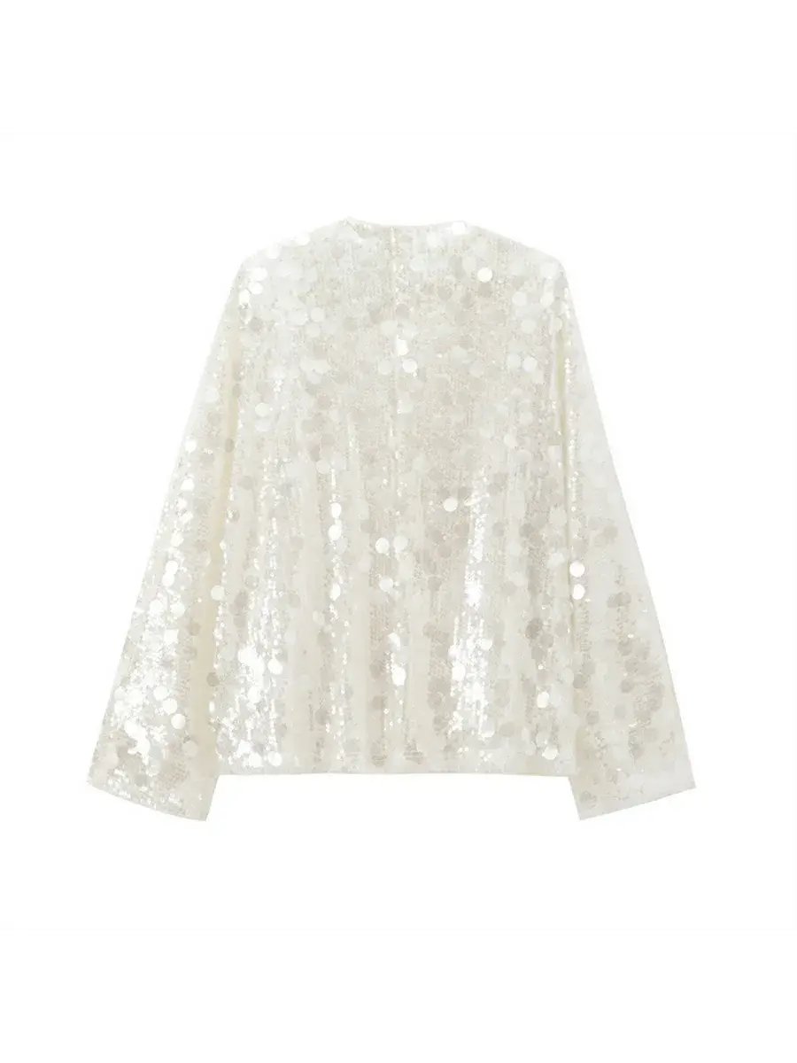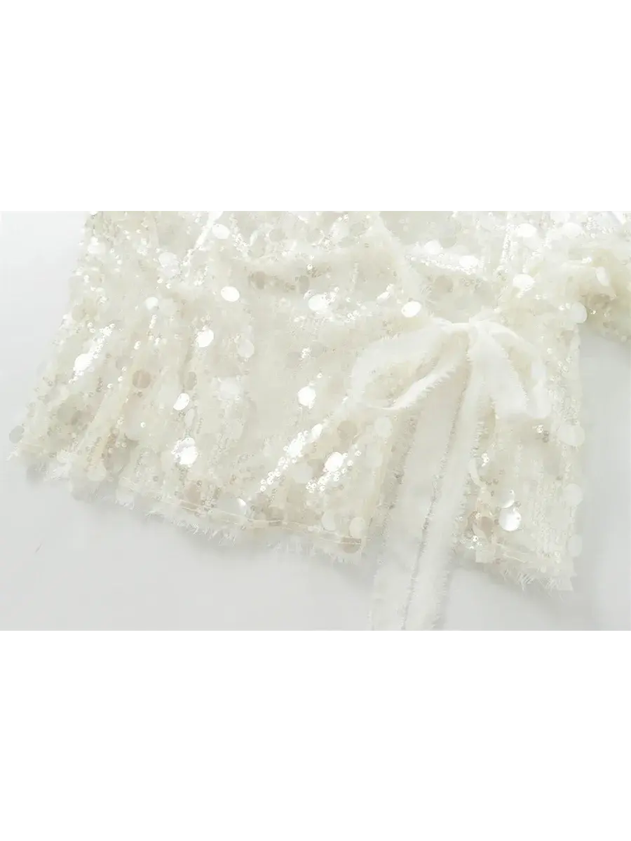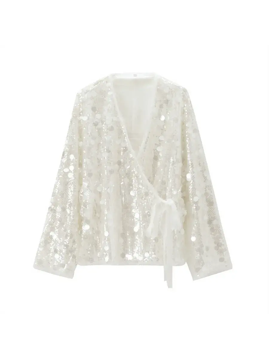Блузка женская в стиле кимоно. Модель оверсайз, на завязках. Рубашка женская с подкладом, материал полиэстер. Внешняя полупрозрачная часть блузки украшена крупными и мелкими бусинами-пайетками. Сочетайте кимоно с класическими или спортивными брюками/юбками/обувью.