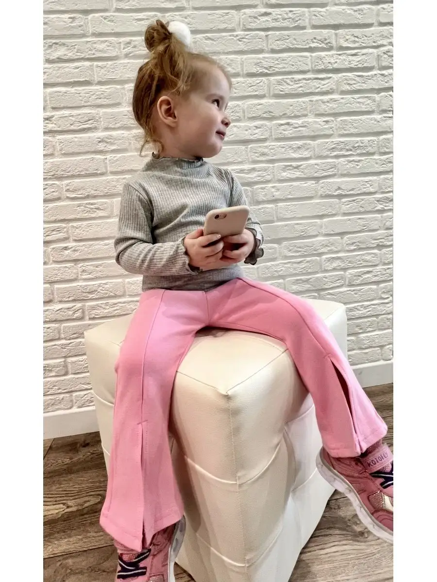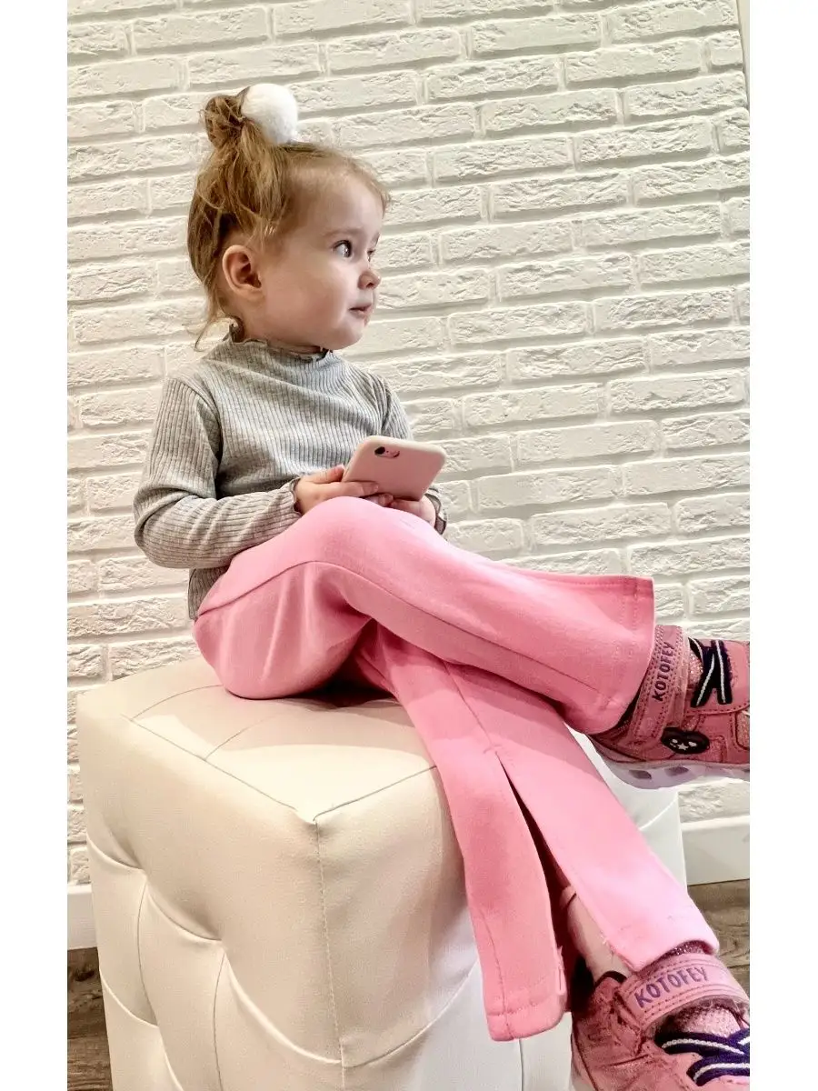 Брюки клеш c разрезами - тренд 2023 года для маленьких модниц идеально подходят для школы , детского сада, занятия спортом, прогулок и активного отдыха. Брюки с разрезами изготовлены на 95% из хлопка для комфортной и безопасной повседневной носки. Модные брюки клеш от колена, на которых застрочены стрелки и сделаны небольшие разрезы от нижнего края по центральным швам. Наши брюки для девочки позволят создать стильный образ на каждый день в комплекте с худи / толстовками / футболками/ свитерами/рубашками / блузками. Благодаря натуральному составу брюки не скатываются и не теряют цвет, отлично тянутся. Удобные детские брюки клеш не сползают, хорошо облегают фигуру, не давят на животик. Они прекрасно подойдут для физкультуры гимнастики/ танцев/ йоги/ фитнеса / для дома и на каждый день. Брюки представлены в 4-х цветах: розовый, черный ,(классический черный прекрасно подойдет для создания строгих образов, либо в школу), бежевый и серый. Посадка высокая, в поясе резинка.