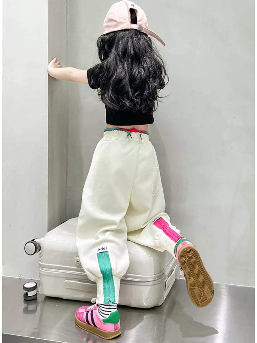 Брюки бананы для девочки спортивные выполнены из дышащей ткани. Изюминка данной модели штанов - цветные замки сзади и цветные двойные шнурки. Летние брюки - джоггеры с высокой посадкой обязательно понравятся Вашей малышке. Брюки имеют два боковых кармана, один накладной карман сзади.