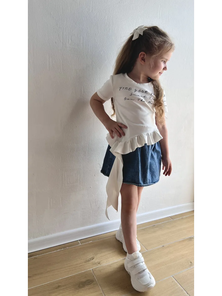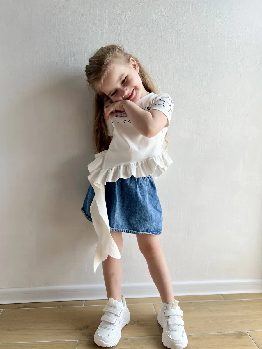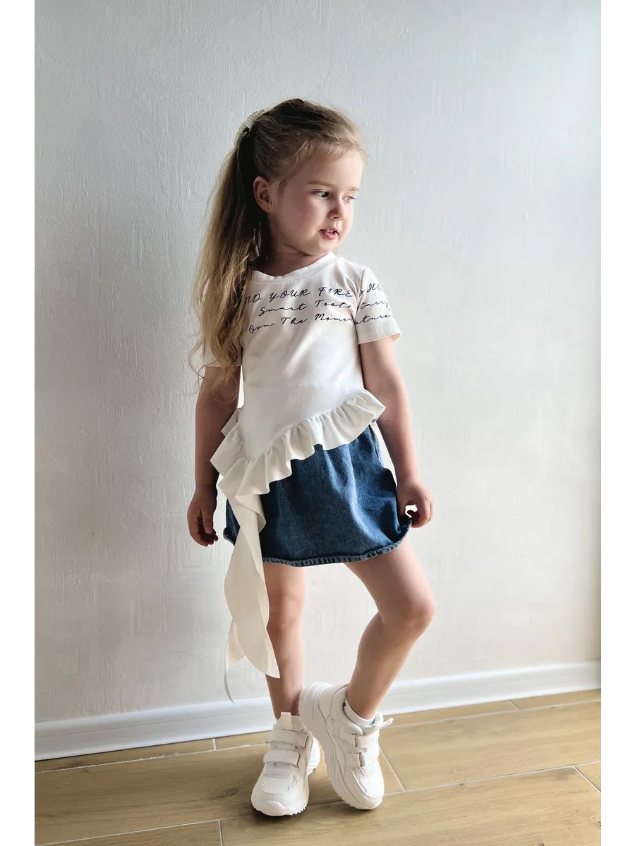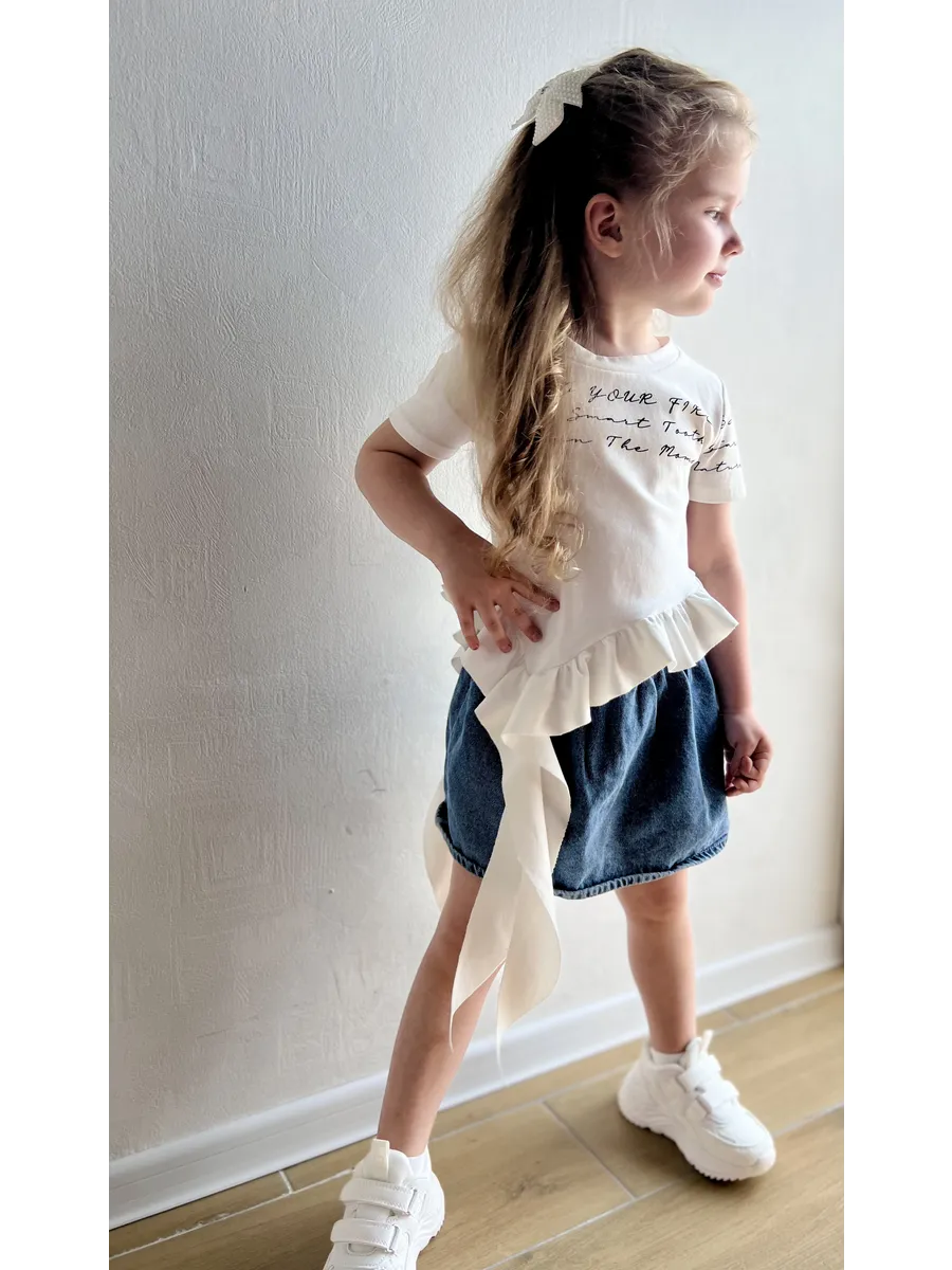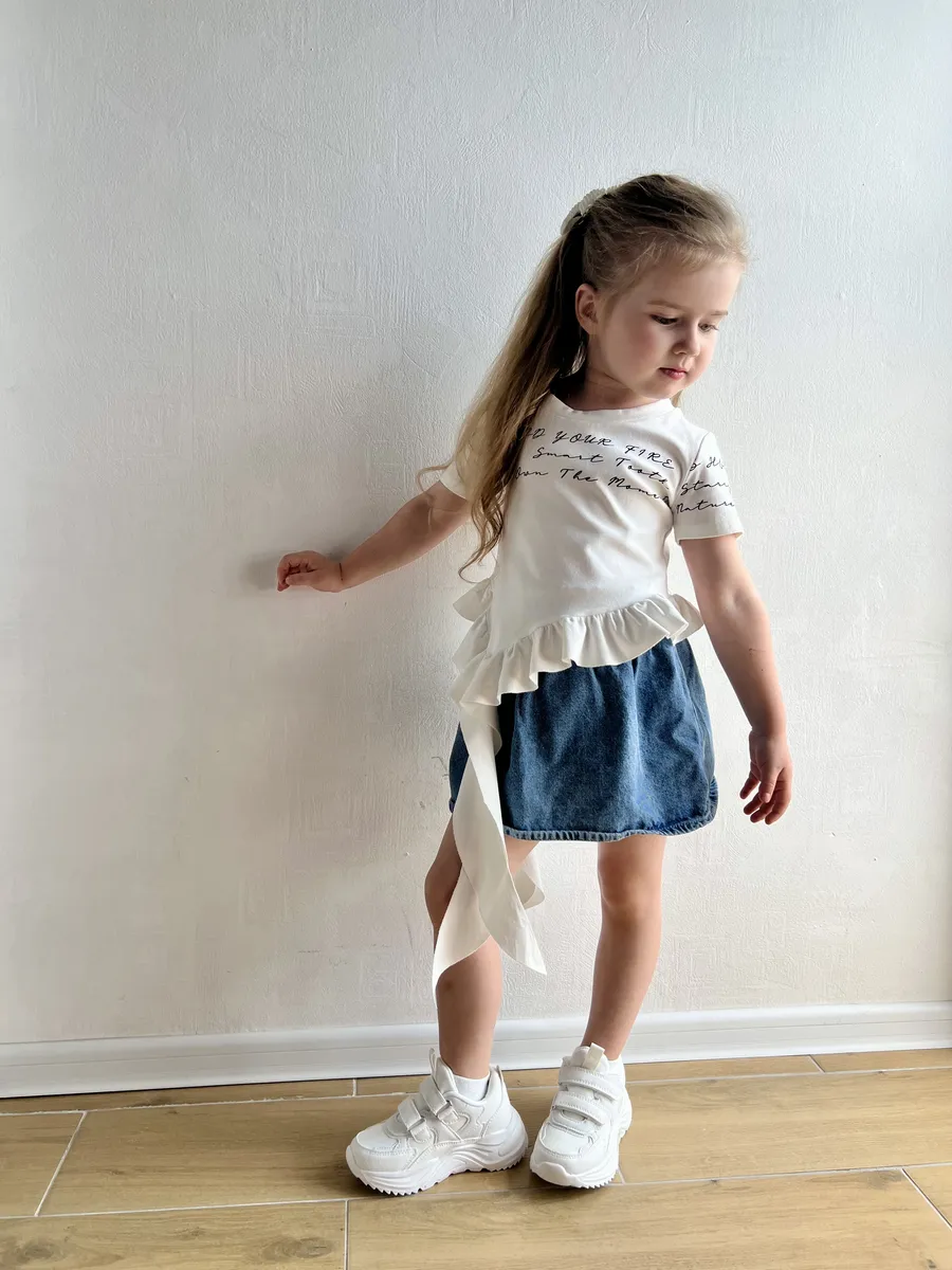 Футболка для девочек от YJ ST - это стильное и комфортное решение для повседневных образов. Модель выполнена из мягкого хлопка и украшена милой надписью, а асимметричный край с воланами добавляет игривости. Благодаря полуоблегающему крою футболка обеспечит максимальный комфорт в течение всего дня. Она станет отличным выбором для прогулок, встреч с друзьями или просто для отдыха дома.