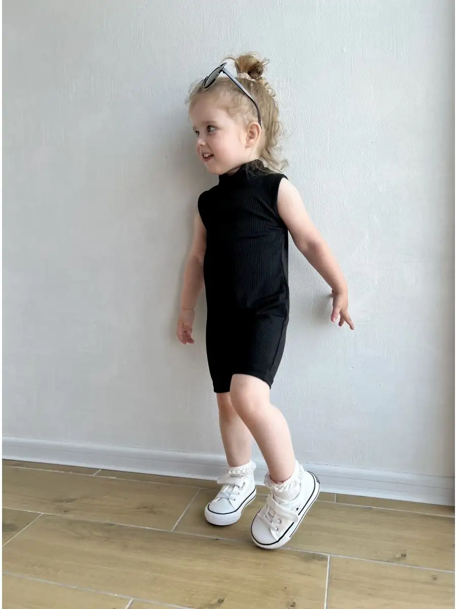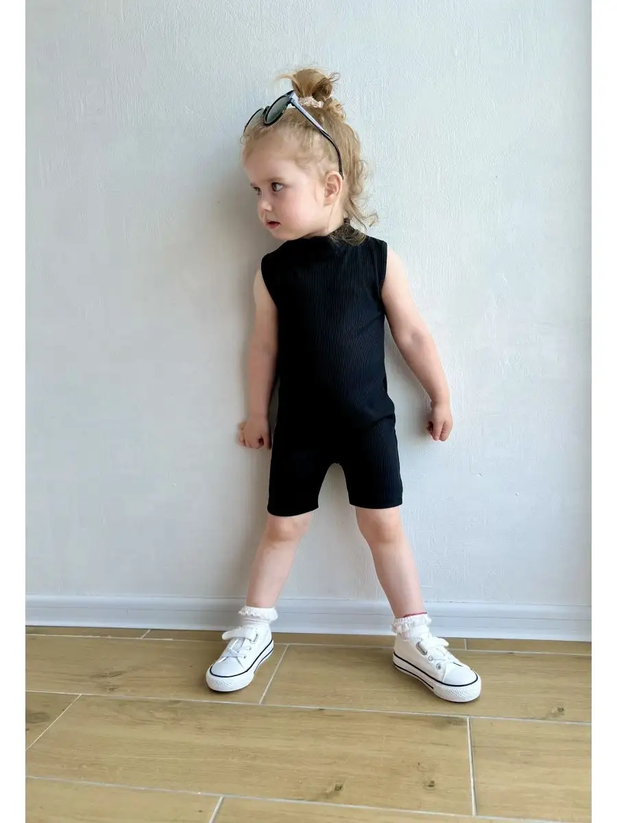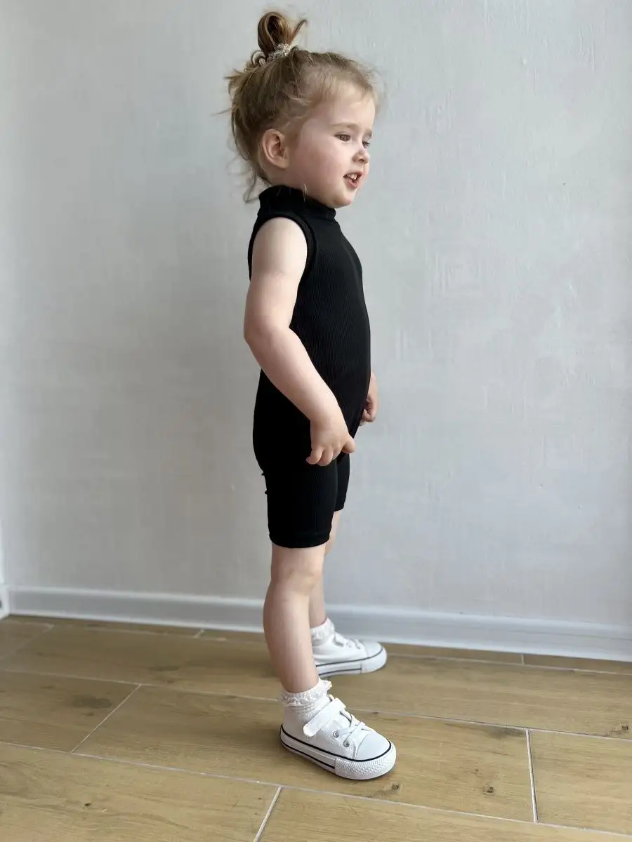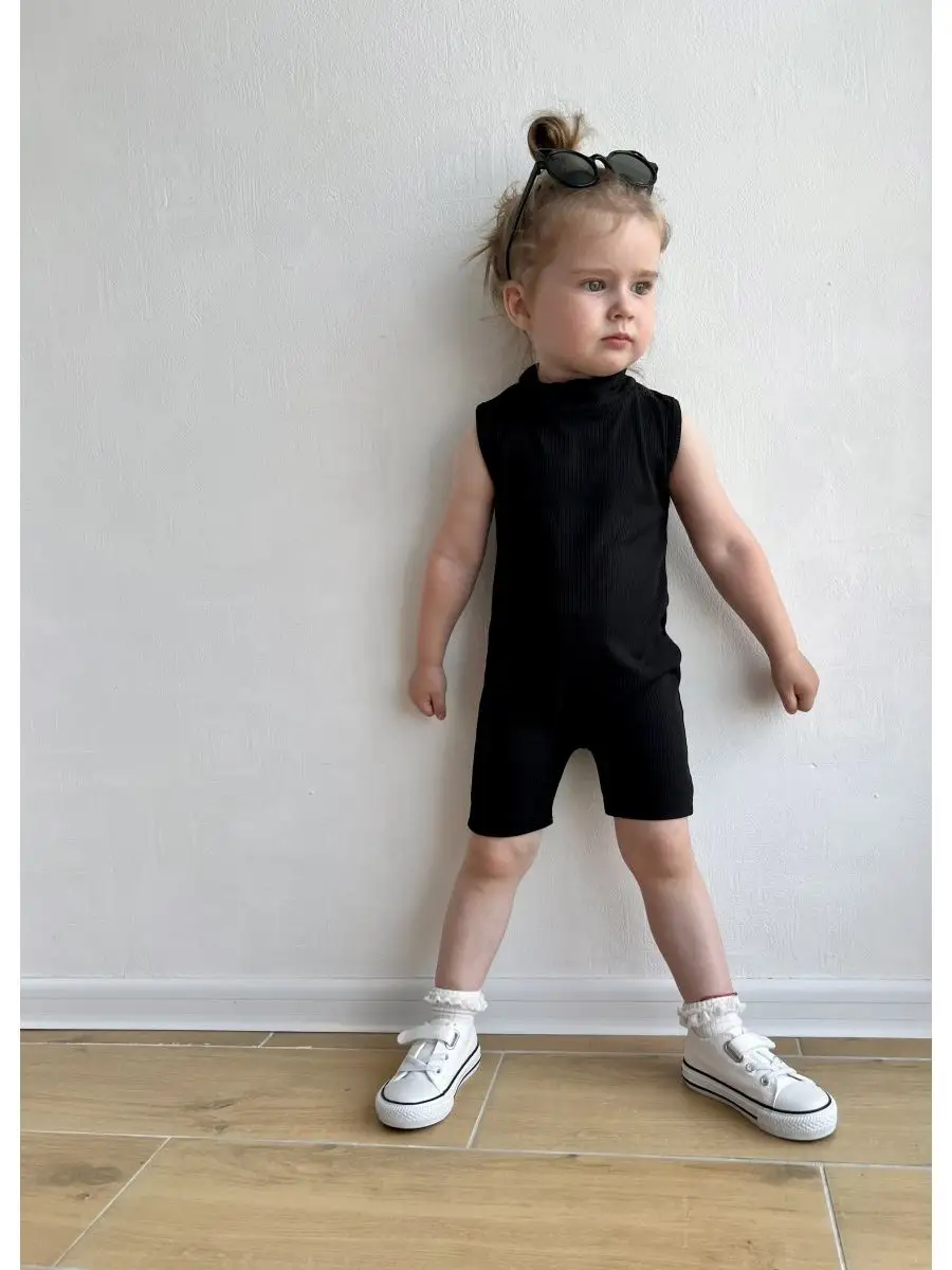 В гардеробе маленькой модницы обязательно должен быть комбинезон. Модель выполнена из дышащей ткани в рубчик, укороченные шортики-велосипедки не сковывают движений. Комбинезон без рукавов. Изюминка модели - воротник-стойка. Для удобного ношения имеется потайная молния на спинке.