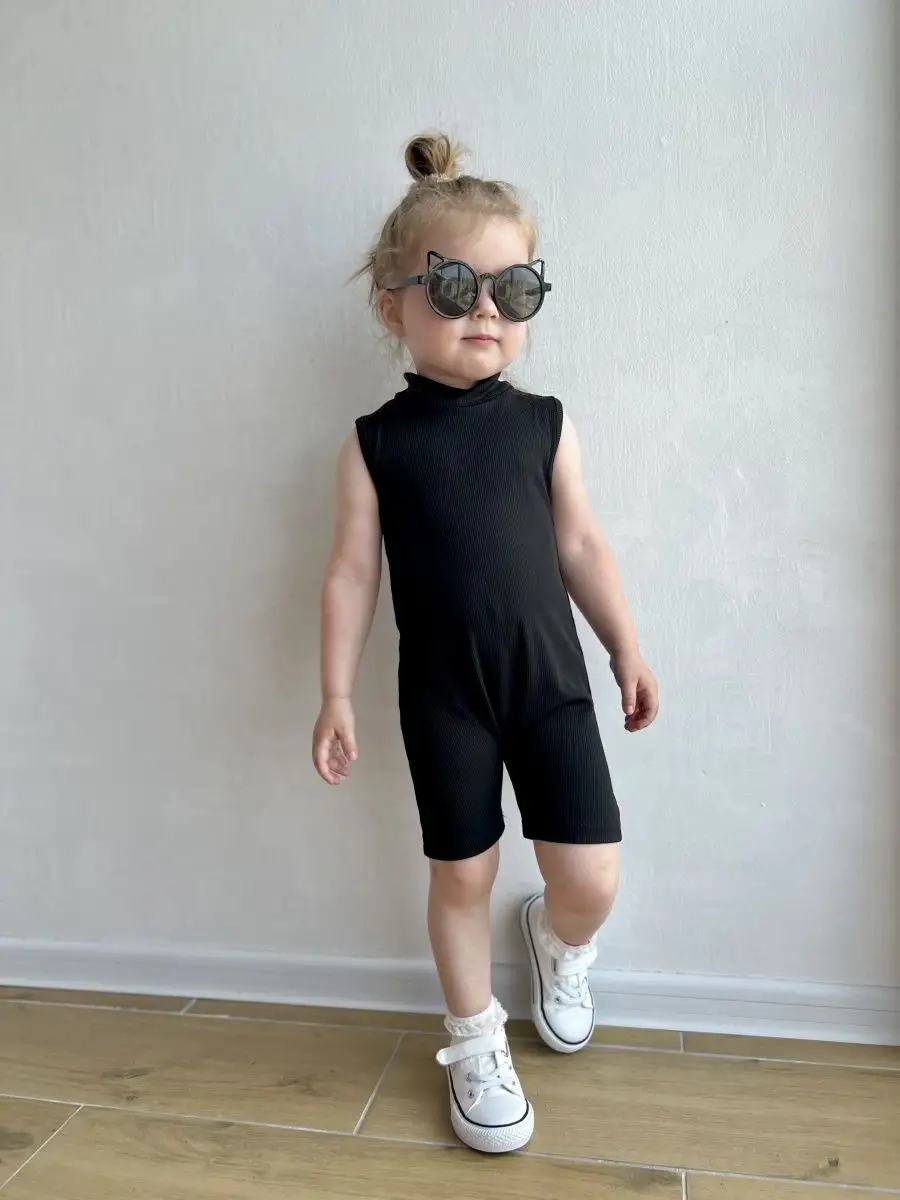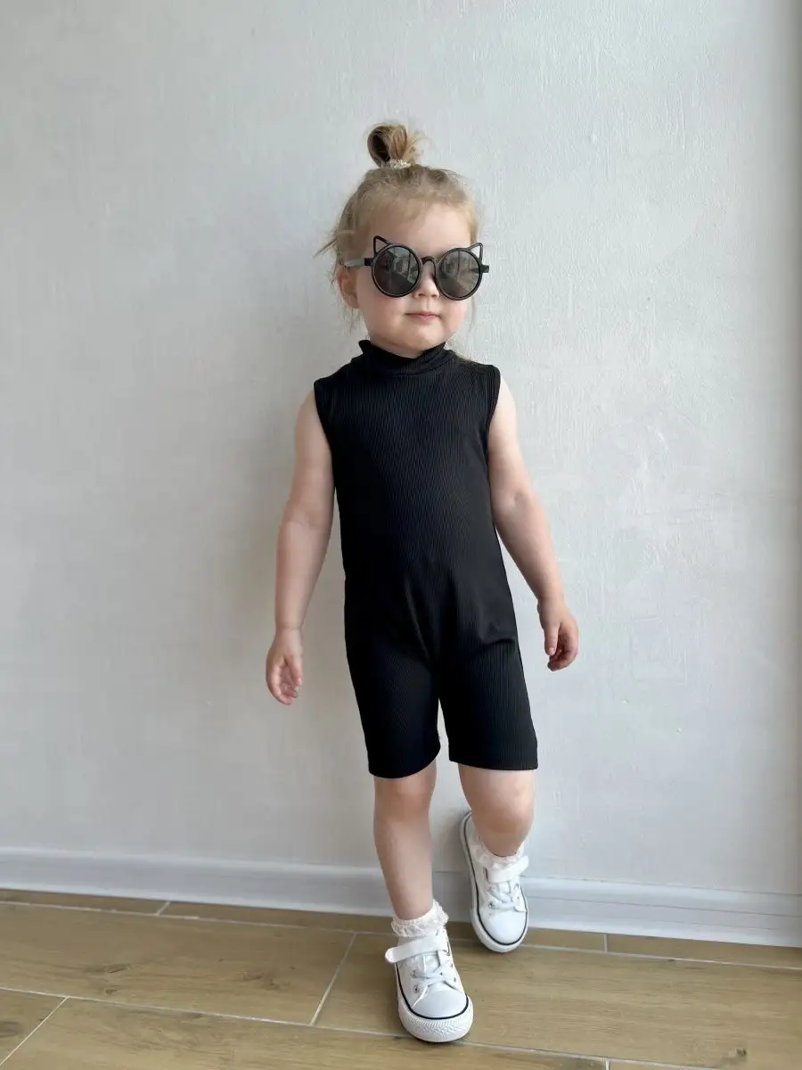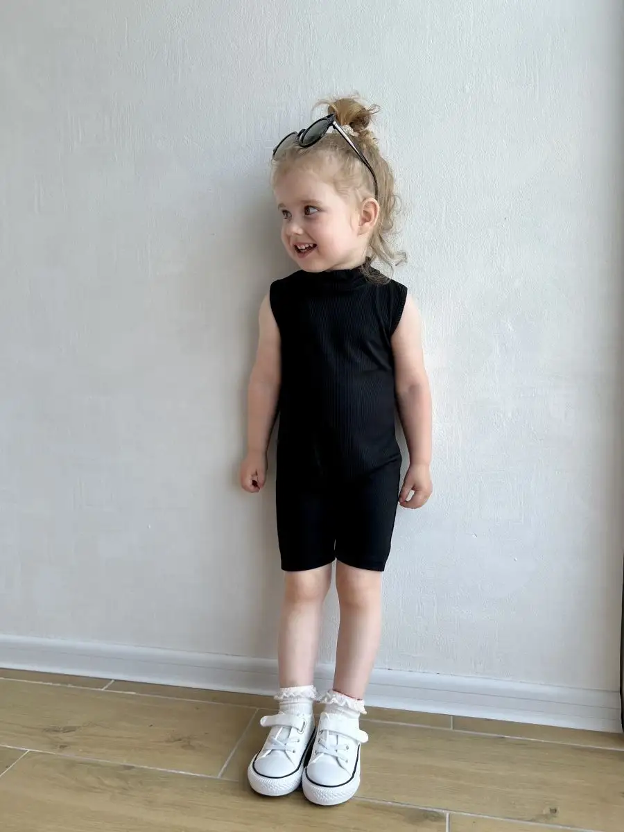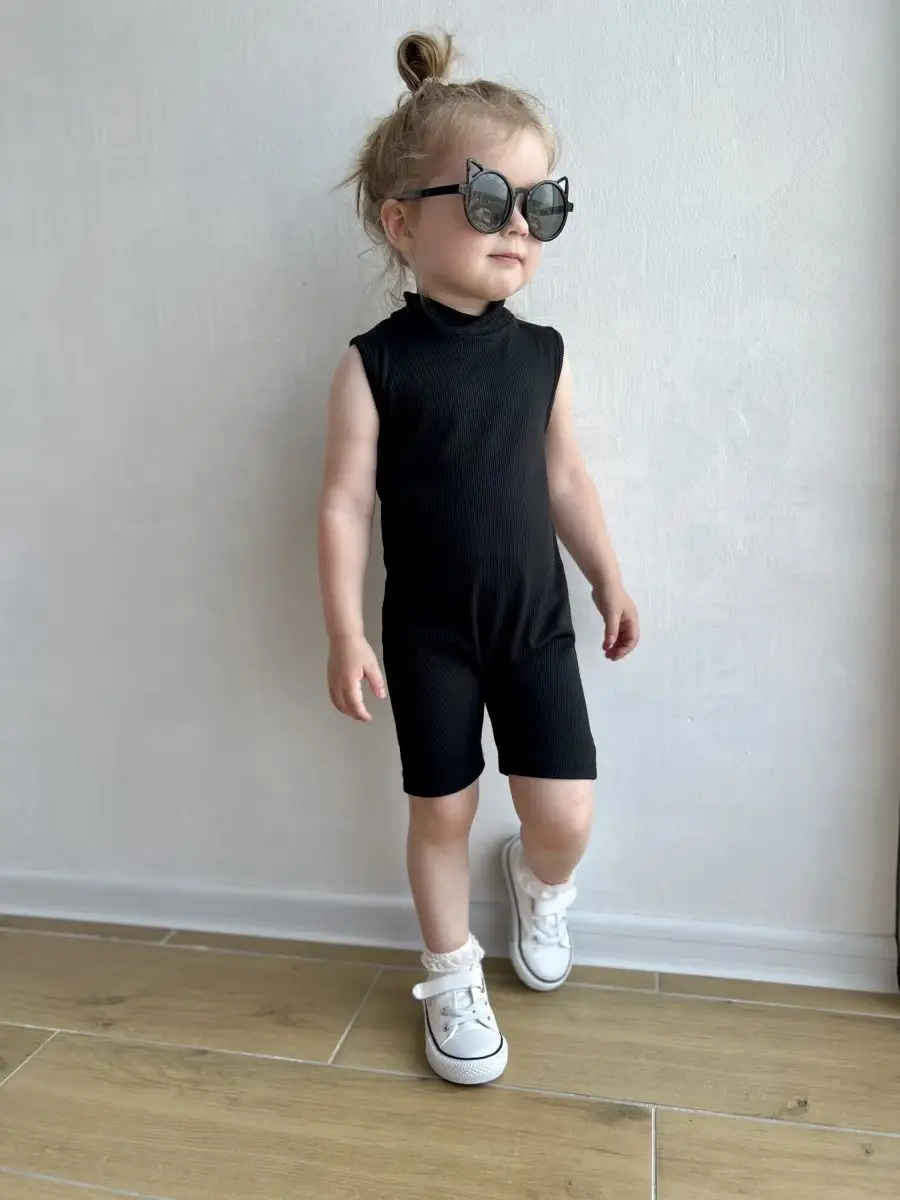 В гардеробе маленькой модницы обязательно должен быть комбинезон. Модель выполнена из дышащей ткани в рубчик, укороченные шортики-велосипедки не сковывают движений. Комбинезон без рукавов. Изюминка модели - воротник-стойка. Для удобного ношения имеется потайная молния на спинке.