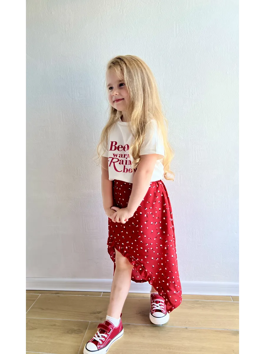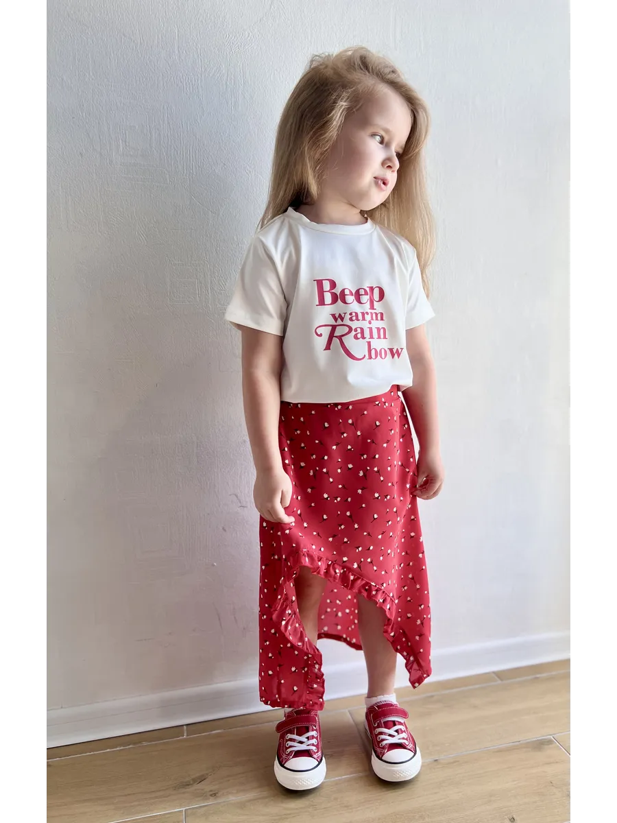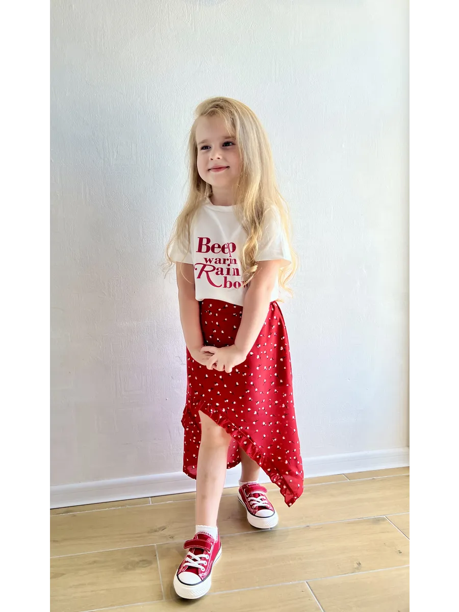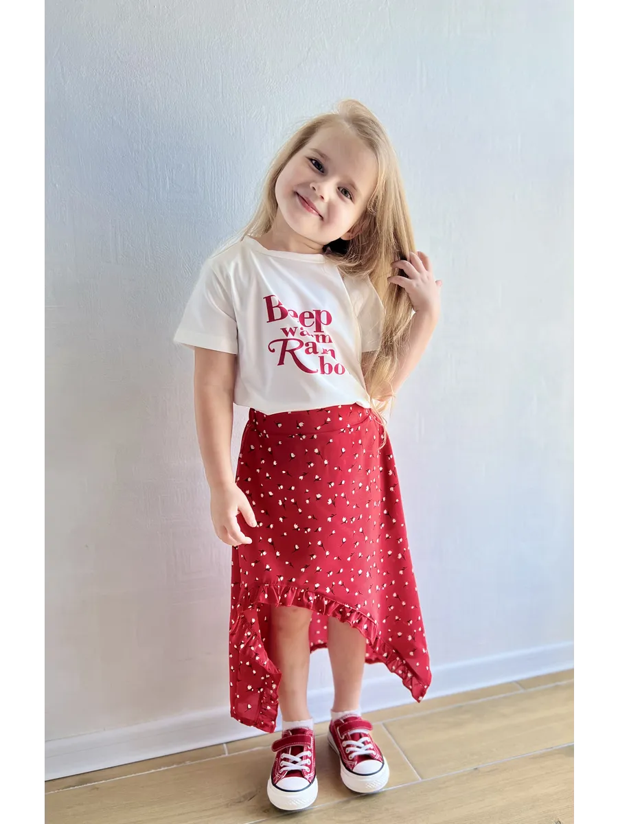 Костюм футболка с юбкой от MDSt - стильное и удобное решение для повседневных образов юных модниц. Мягкий и приятный к телу материал из полиэстера и вискозы обеспечит комфорт в течение всего дня. Юбка миди с вырезом и шортиками добавляет игривости и свободы движений, а надпись на футболке и цветочный принт на юбке создают яркий и индивидуальный образ. Этот костюм станет отличным выбором для детского сада, школы или прогулок с друзьями.