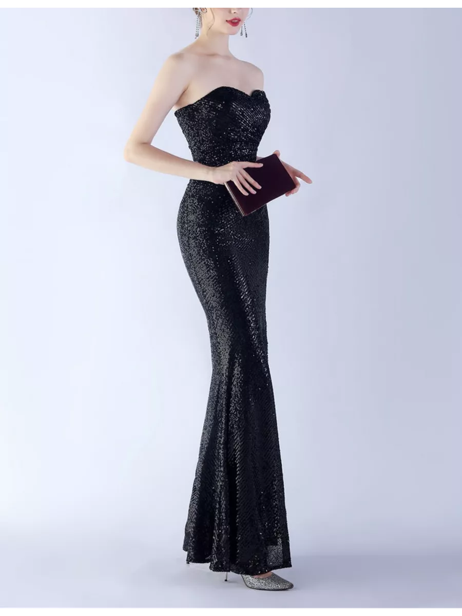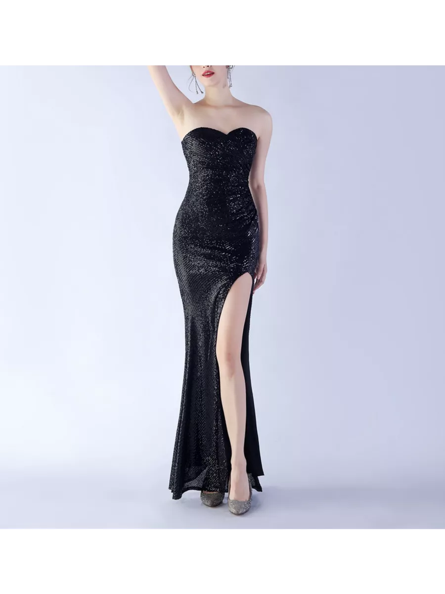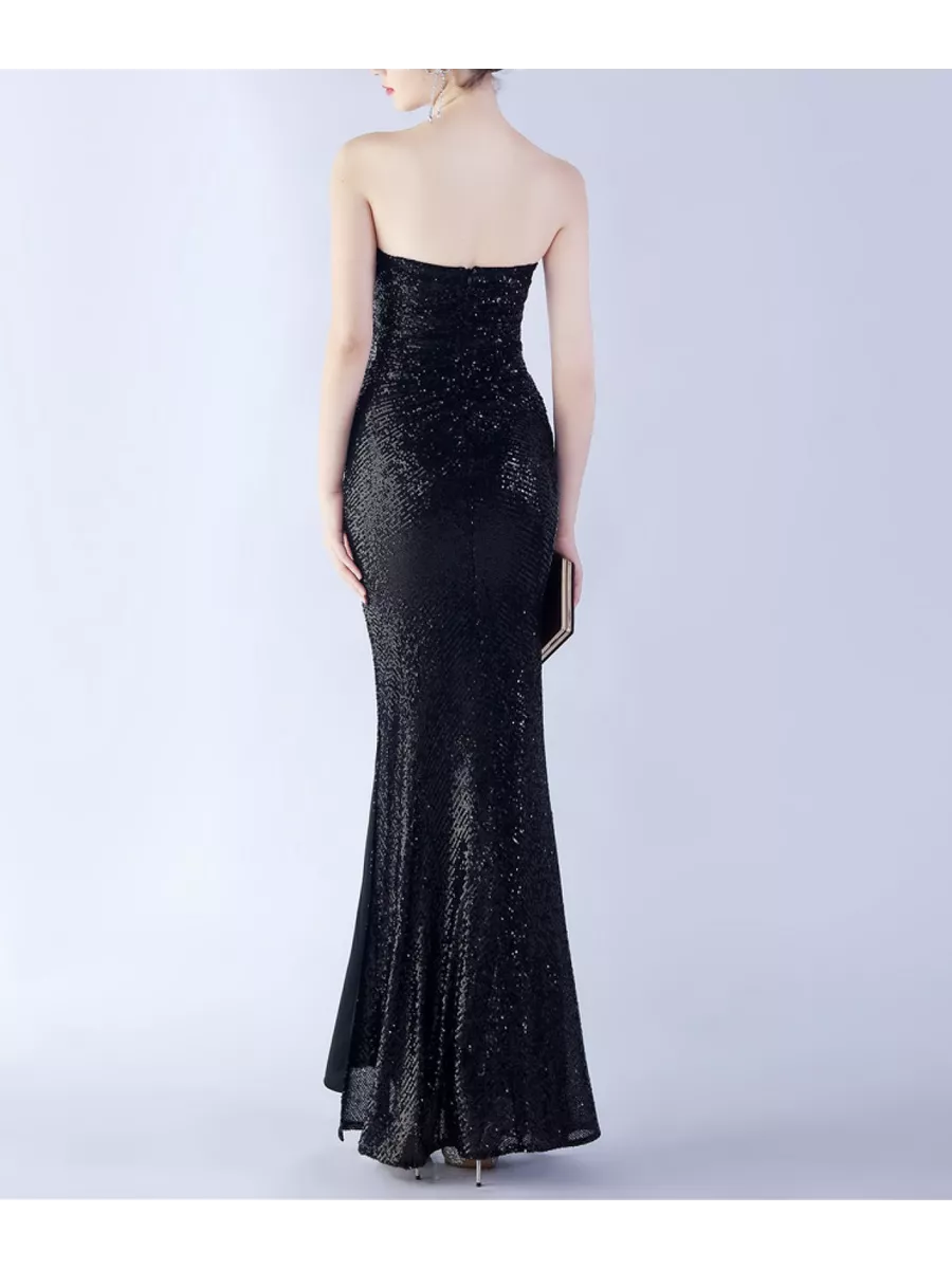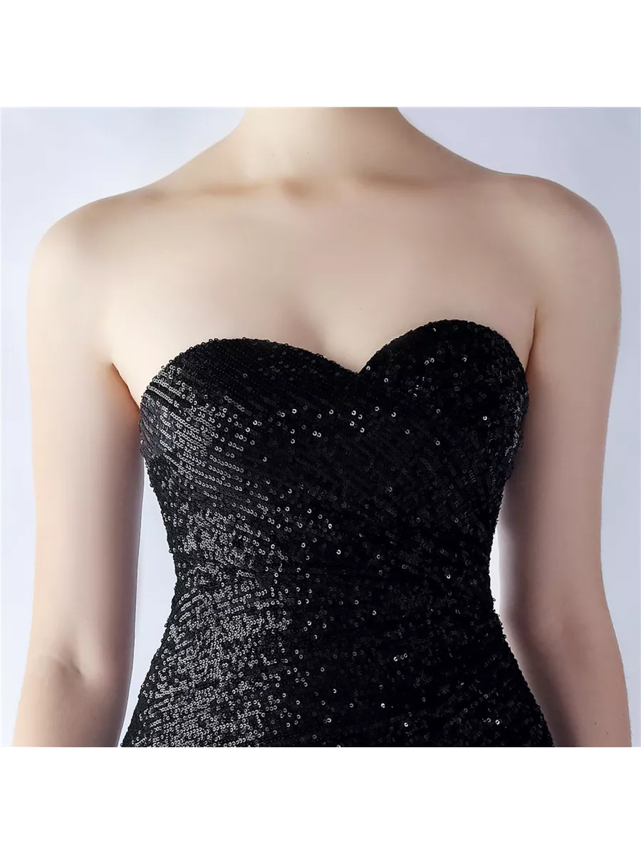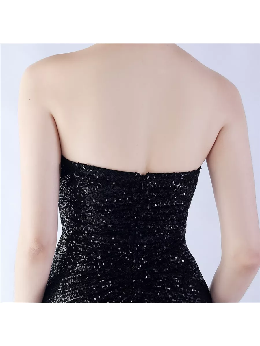 Шикарное вечернее платье бандо из пайеток с подкладом, с чашечками для груди. В комплекте идут прозрачные лямки. Молния сзади, разрез на ноге.