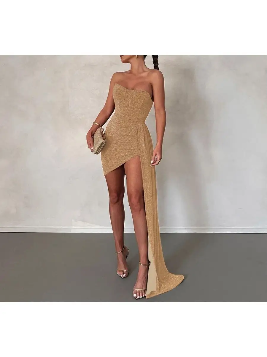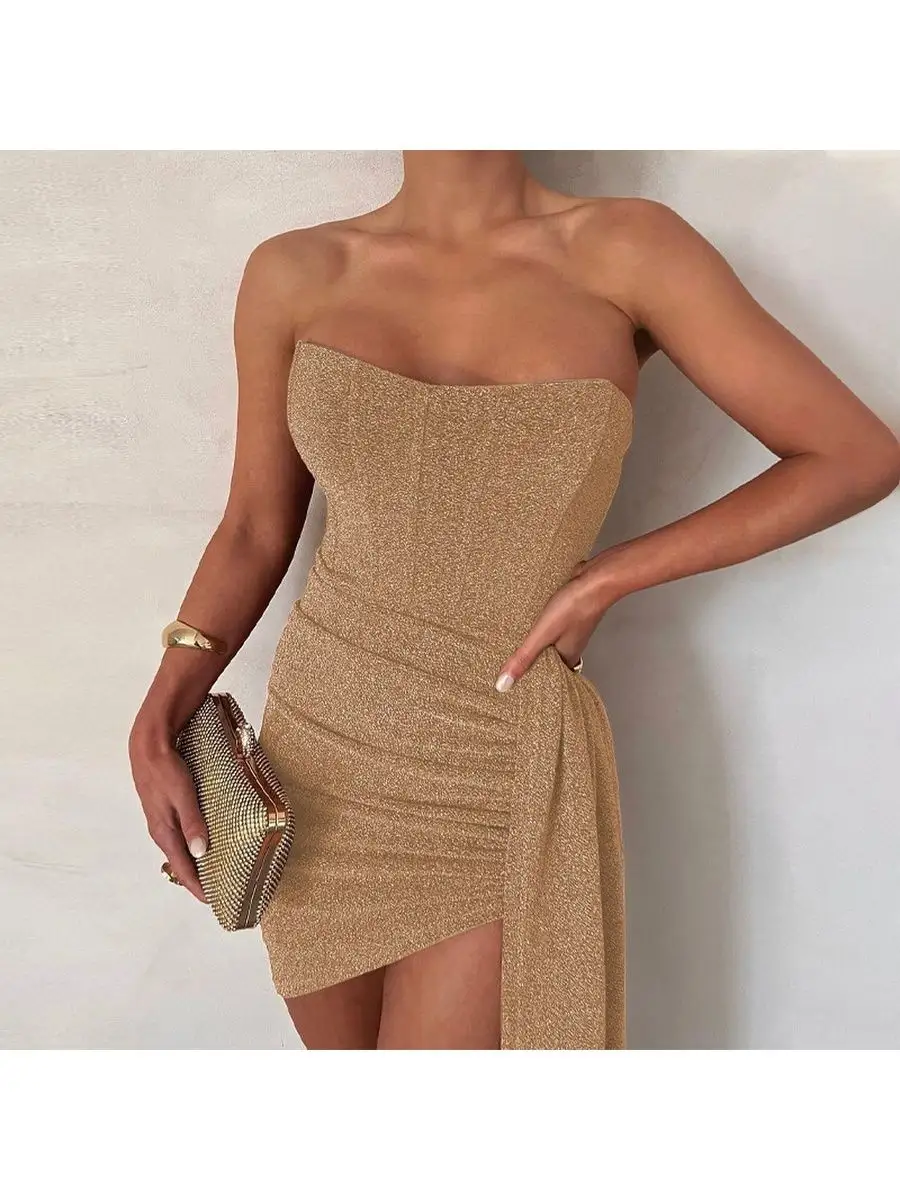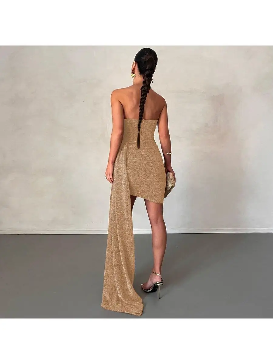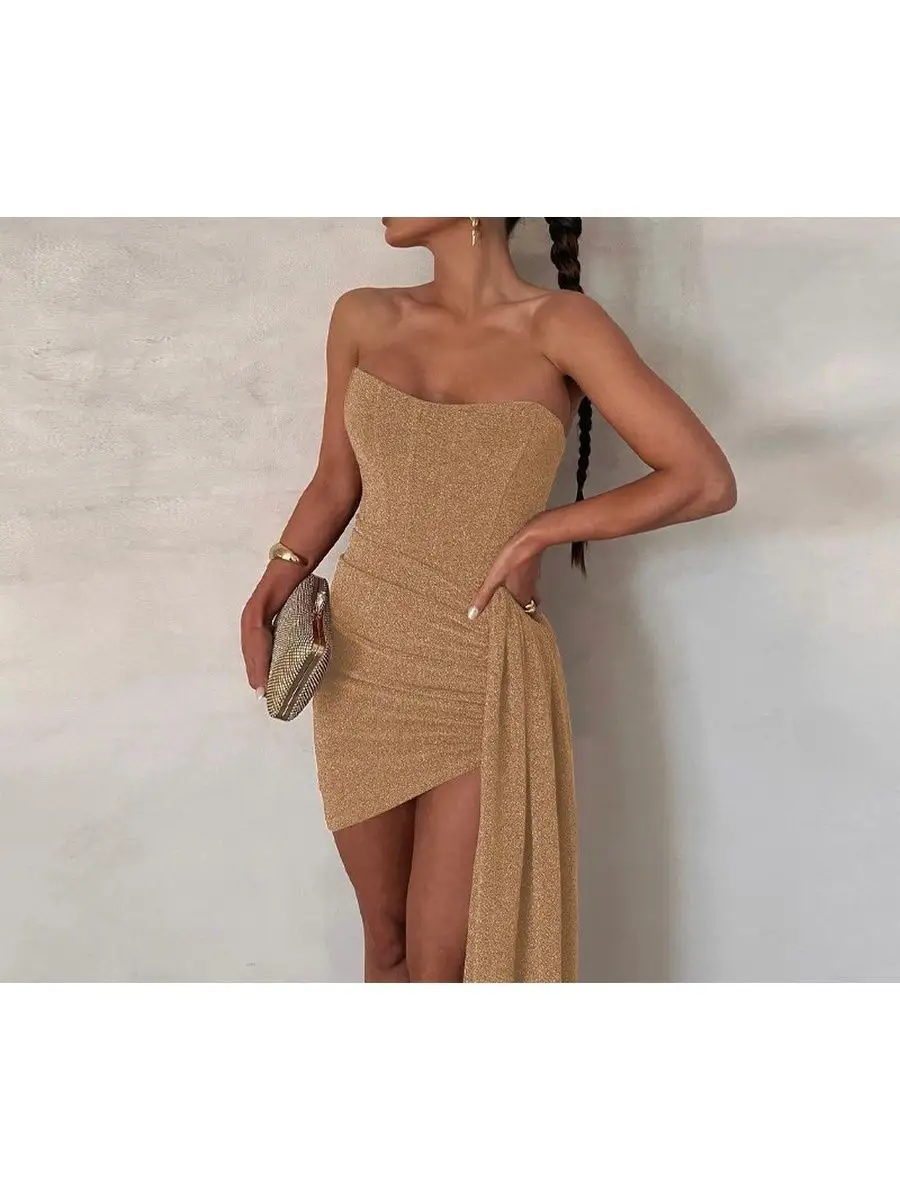 Сверкающее платье супер мини облегающего кроя, с открытыми плечами и имитацией корсета подойдет для встречи нового года, вечеринки, ночного клуба, похода в ресторан или для любого другого торжественного мероприятия. Трендовое сексуальное платье украшено шлейфом сбоку, без подклада, не имеет застежки/молнии.