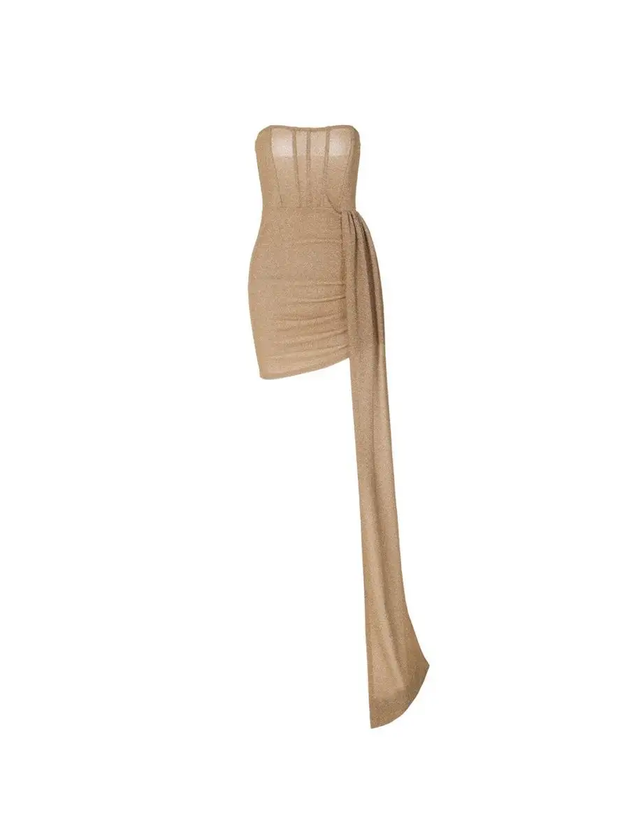 Вечернее коктейльное мини платье с корсетом и шлейфом. Платье выполнено из эластичной ткани с люрексом (Обратите внимание!!! если у Вас очень чувствительная кожа, края возможно будут доставлять дискомфорт, из-за небольшого соприкосновения с люрексом). Низ мини платья асимметричный.