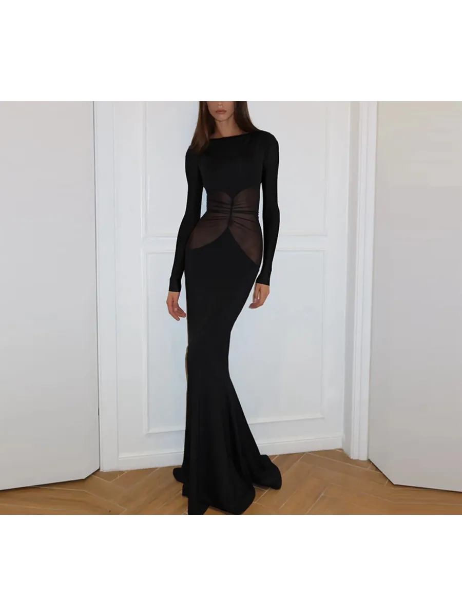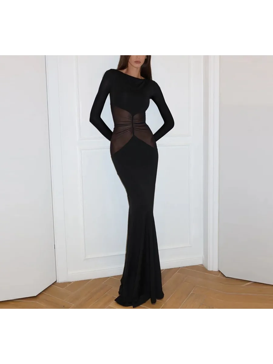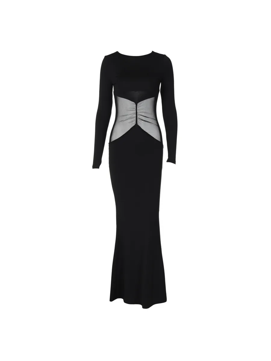 Облегающее длинное платье из коллекции весна-лето 2025 станет идеальным выбором для любого торжественного мероприятия. Модель выполнена из гладкой ткани с добавлением эластана, которая облегает фигуру и подчеркивает все ее достоинства. Асимметричная сетка с драпировкой добавляет образу загадочности и изысканности. Длинные рукава и облегающий покрой делают это платье подходящим для прохладных вечеров. Благодаря универсальному черному цвету, его можно легко комбинировать с различными аксессуарами и обувью.
