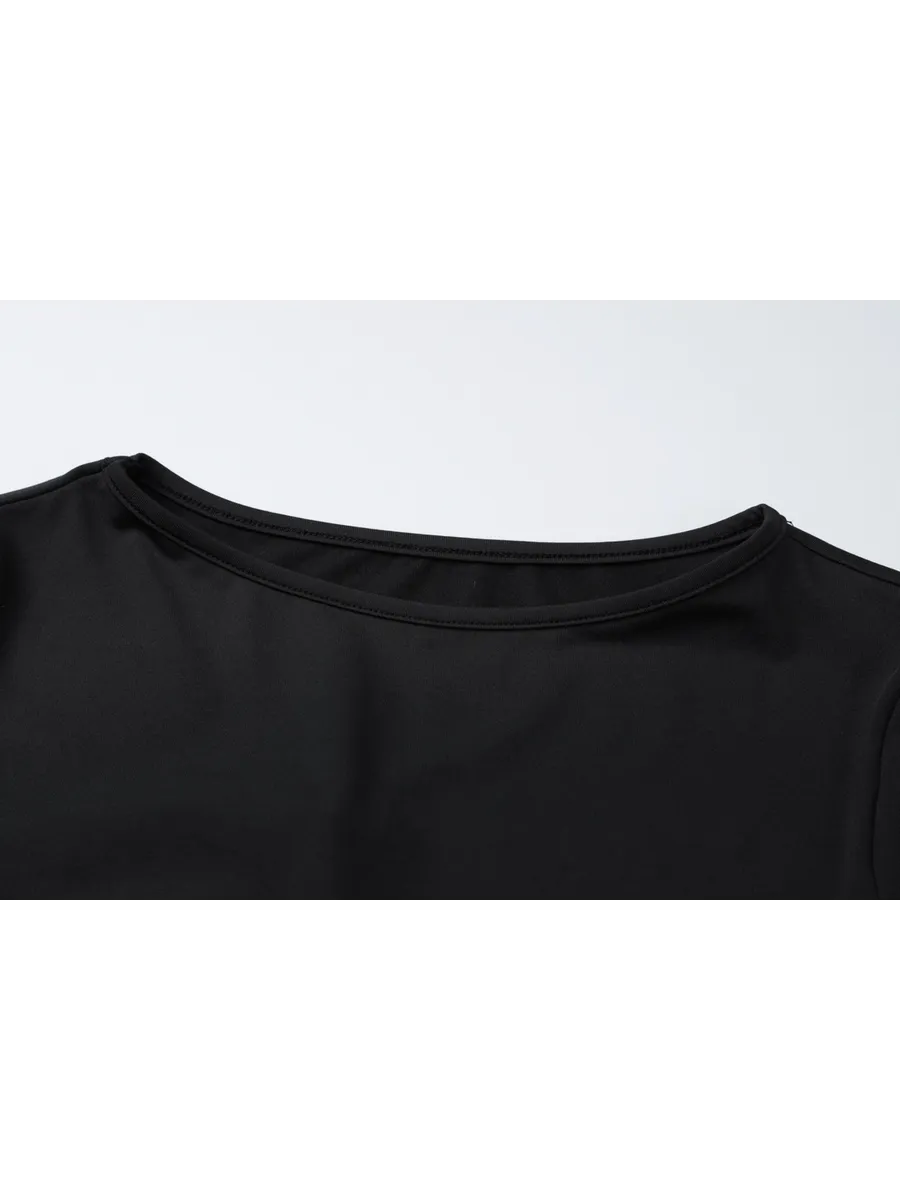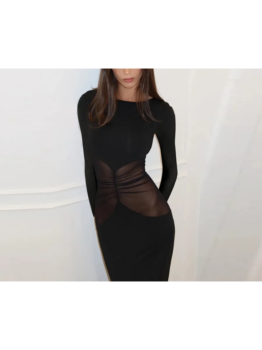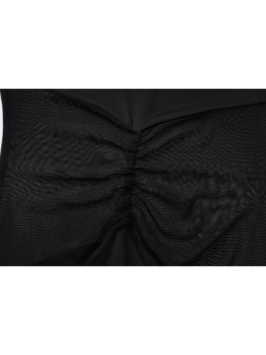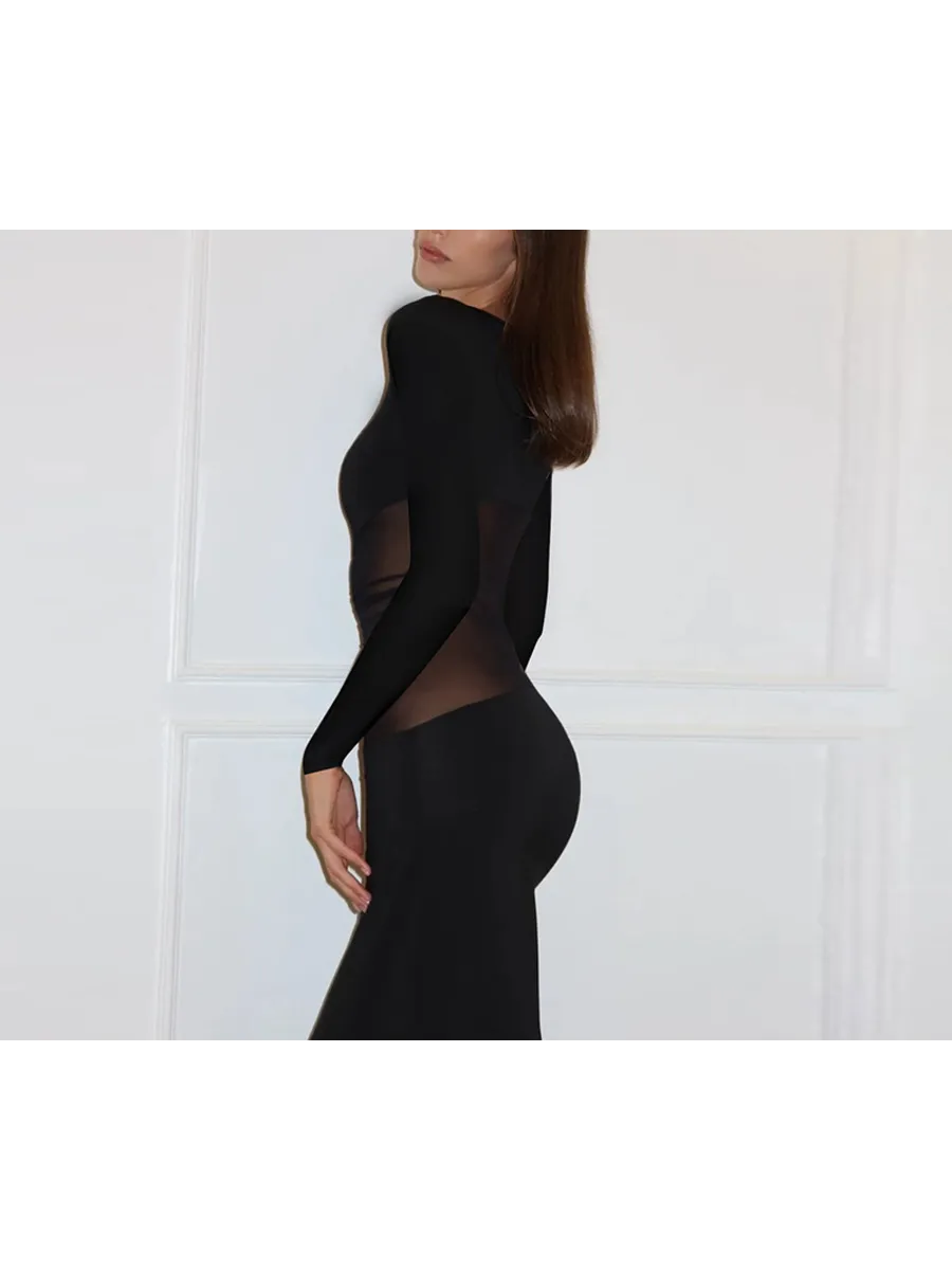 Облегающее длинное платье из коллекции весна-лето 2025 станет идеальным выбором для любого торжественного мероприятия. Модель выполнена из гладкой ткани с добавлением эластана, которая облегает фигуру и подчеркивает все ее достоинства. Асимметричная сетка с драпировкой добавляет образу загадочности и изысканности. Длинные рукава и облегающий покрой делают это платье подходящим для прохладных вечеров. Благодаря универсальному черному цвету, его можно легко комбинировать с различными аксессуарами и обувью.